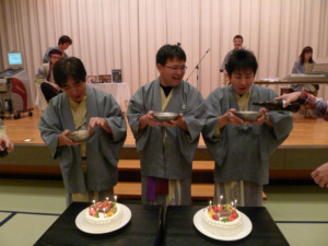 そして、お誕生日の方のお祝いもしました!もちろんDバンドのハッピーバースデーの演奏付きです。私たちも歌いました。武藤さん、すぎもとさん、西尾くんお誕生日おめでとうございます。金さんより、小さい鍋にビールを注がれています笑。