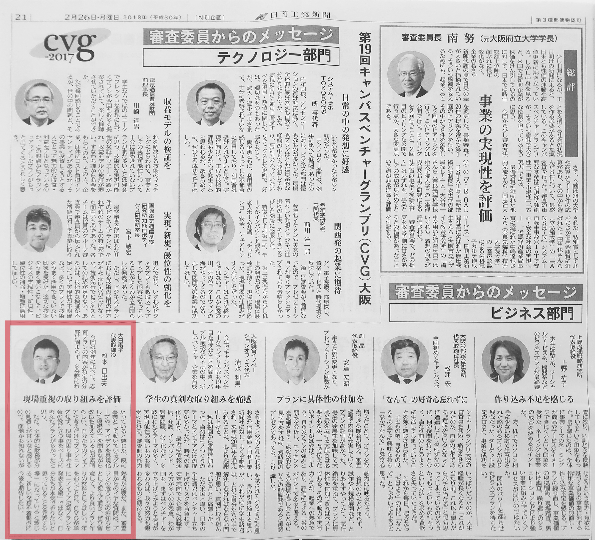| 2018年02月16日 | 日刊工業新聞『第19回キャンパスベンチャーグランプリ大阪』 |