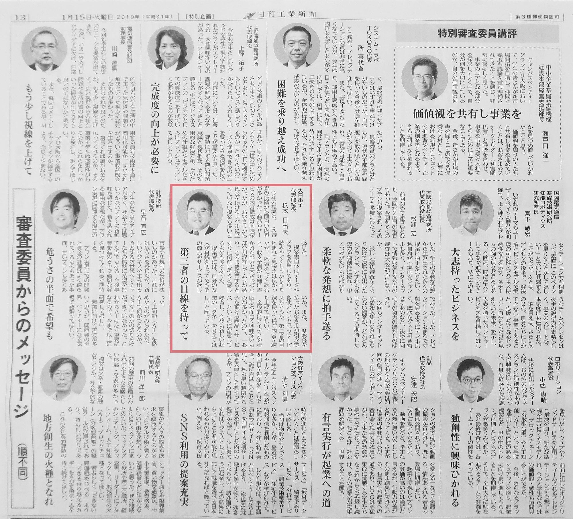 | 2019年01月15日 | 日刊工業新聞『第20回キャンパスベンチャーグランプリ大阪』 |